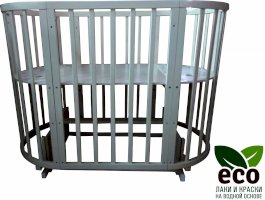 Выполнена из отборной бессучковой древесины березы без стыков, склеек и из высокопрочного МДФ. Привлекательный внешний вид достигается за счёт использования технологии скрытия стыков и метода тройной шлифовки. Покрыта нетоксичными лаками и красками на водной основе. В комплекте имеется 4 колёса с возможностью установки в различных положениях (для круглой и овальной кроватки).