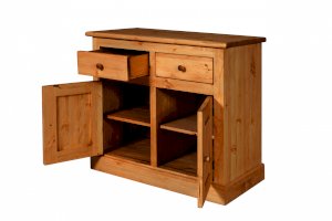 2 дверки, 2 ящика. За каждой дверкой по одной полке.