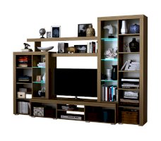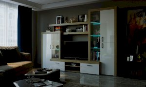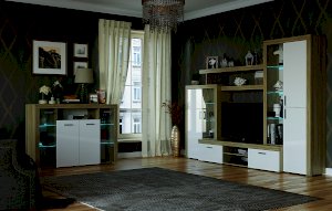 Гостиная «Орландо» опционально может комплектоваться светодиодной подсветкой стеклополок витрин. Фасадная часть гостиной подчёркнута стильными планками МДФ, представляющими собой элементы корпуса и фасада.