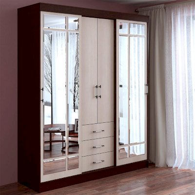 Шкаф-купе Маэстро – отличный выбор для хранения одежды и обуви как в прихожей, так и в спальне. Модель оснащена двумя дверками на роликовых направляющих, которые декорированы зеркалом. Центральная часть шкафа состоит из трех выкатных ящиков, а также отделения с распашными дверками, за которыми расположились вместительные полки для трикотажа и белья. Все фасады дополнены стильными и эргономичными ручками. Изделие выполнено из ЛДСП.