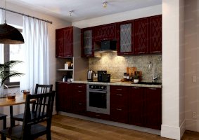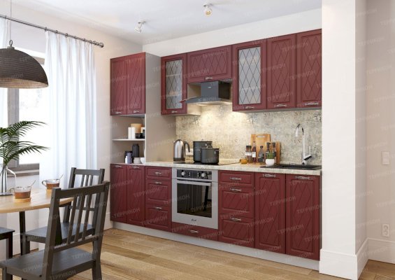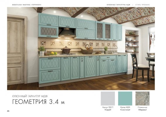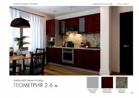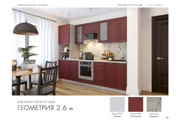 Набор кухонной мебели «Геометрия» получил свое название благодаря оригинальному дизайну. Дело в том, что его фасады украшены незатейливыми симметричными узорами, состоящими из небольших ромбов. Также комплекту присущи симметрия и простота форм. У покупателей есть возможность выбирать цветовое решение: в ассортименте изделия оттенков топаз, тирамису, гранат, алмонд.