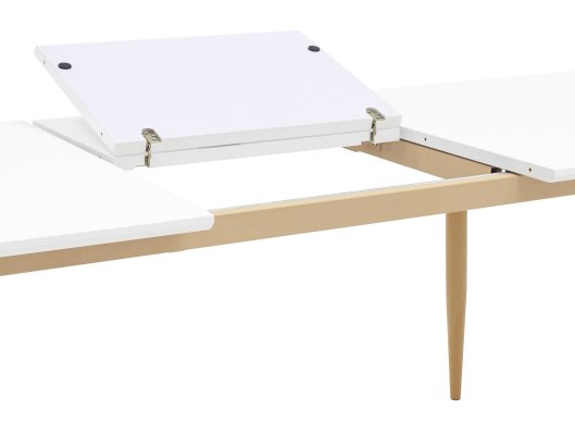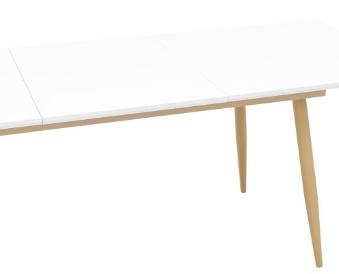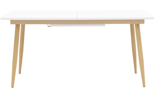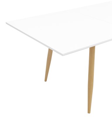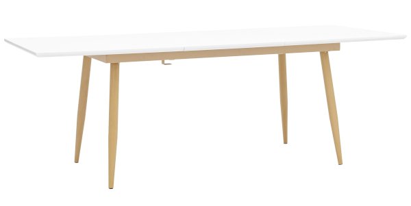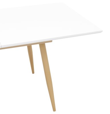 Обеденный стол с прямоугольной столешницей. Цвет столешницы белый. Ножки металлические, покрашены в цвет светлого дерева.