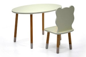 Края столешницы закруглены и покрыты кромкой ПВХ для безопасности ребёнка. Ножки стола тщательно отшлифованы и покрыты лаком на водной основе. Нижняя часть ножек окрашены белой эмалью на водной основе.