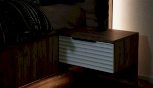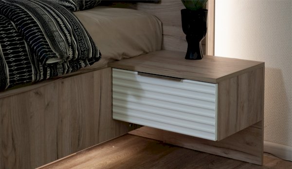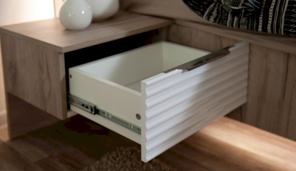 Прикроватная тумба Джулия - представитель европейского стиля минимализм. Декором белым глянцевым фасадам High Gloss служит фрезерованный рисунок «Волна» - подчеркивает зеркальный блеск, делает интерьер спальни особенным и неповторимым. Торцевые ручки из хромированного металла - яркий акцент фасадов. Тумба крепится к кровати - создает визуальную целостность, усиливает иллюзию парения. Выдвижной ящик на телескопических направляющих - поместит в себя все вещи, которые важно иметь под рукой - телефон, светильник или любимая книга. Идеально компонуются со всеми модулями системы Джулия.
