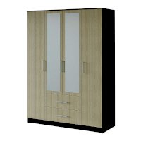 Вместительный четырёхстворчатый шкаф Фиеста справится с большим гардеробом и другими вещами. Модель выполнена из качественной ЛДСП. Корпус сделан в темном цвете венге, а фасады – в светлом лоредо. Комплектация представляет собой центральную зону с двумя нижними выкатными ящиками и отделения со штангой для одежды на плечиках. Справа и слева расположились многочисленные полки для вещей. В створки центральных дверок вмонтированы зеркала.
