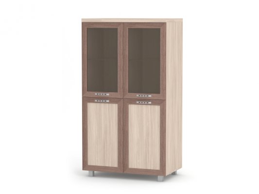Данные изображения представлены в следующих цветах: корпус - Ясень Шимо светлый, фасады: рамка МДФ - Ясень Шимо тёмный + филёнка - Ясень Шимо светлый / стекло БРОНЗА.