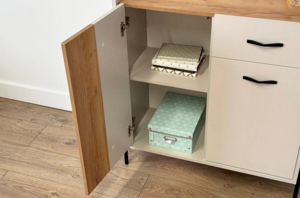 С другой стороны комод оборудован выкатным ящиком, который обеспечивает легкий доступ к часто используемым предметам. Под ним расположен большой глухой фасад, скрывающий за собой просторное хранилище для более крупных вещей.