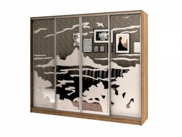 Данное изображение представлено в следующих цветах: корпус - Дуб Сонома, фасады - зеркало с пескоструйным рисунком, рамка двери и треки - Серебро матовое.