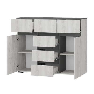 Комод «Мрия» состоит из 2 боковых зон с полками и 6 ящиков, в которых удобно хранить постельное бельё и мелочи.
