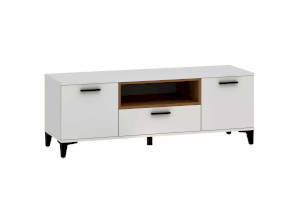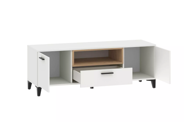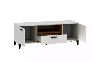 Тумба оснащена полками за распашными дверками, ящиком, который выдвигается плавно и бесшумно благодаря шариковым направляющим, а также открытой нишей, в которой можно удобно расположить книги или элементы декора, а высокие опоры придают внешнюю легкость и обеспечивают быстрый и легкий доступ во время уборки.