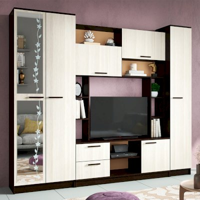 Гостиная Флора невероятно вместительный вариант. В ней вы сможете расположить телевизор, всю необходимую аудиотехнику, а верхние и нижние ящики прекрасно подойдут для документов и личных вещей. Модель гостиной Флора венге имеет два полноценных шкафа, один из которых двустворчатый и оснащен штангой для вешалок с вашей одеждой. Наличие зеркальной дверцы с декоративным цветочным орнаментом позволяет расширить пространство.