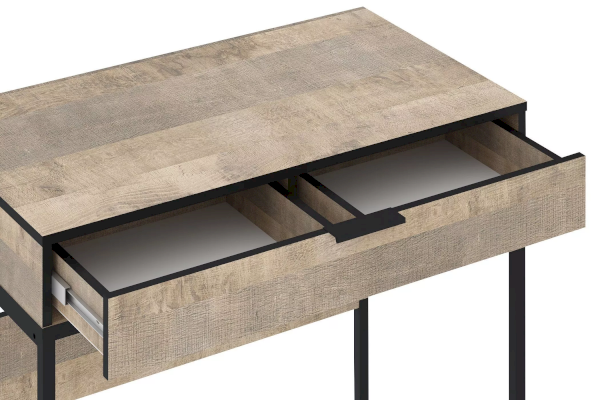 Стол представлен в двух цветах на выбор – Дуб Гранж Песочный и Дуб Самдал и оснащен выдвижным ящиком со встроенной перегородкой, которая позволит удобно организовать все необходимые документы или украшения.