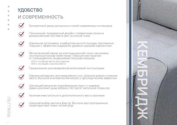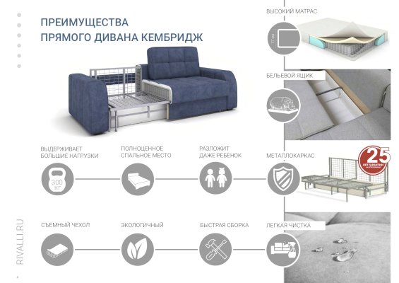 В основе Кембриджа металлический каркас из конструкционной стали с высокими эксплуатационными свойствами и повышенной гарантией от производителя, который выдерживает большие нагрузки: 200 кг на общее место для сидения, 300 кг на общее спальное место. Диван - идеальный вариант для ежедневного сна за счет широкого ровного спального места и высокого анатомического матраса с ортопедическим эффектом.