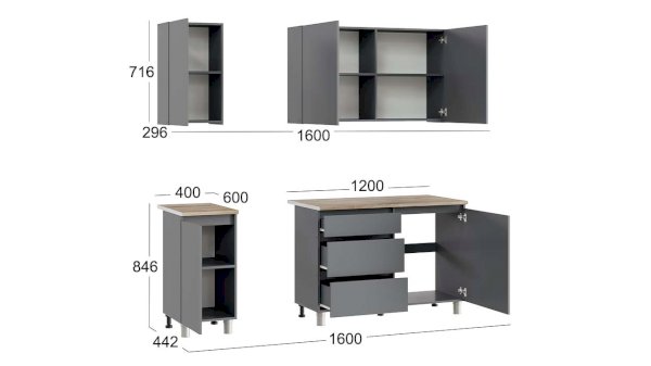 Сборка: нижнего корпуса шириной 1200 мм ящики всегда слева, верхних корпусов и стола 400 мм - универсальная