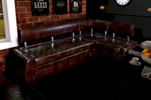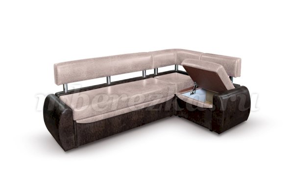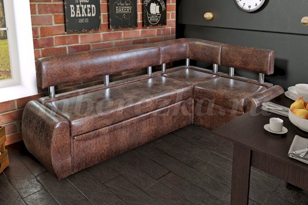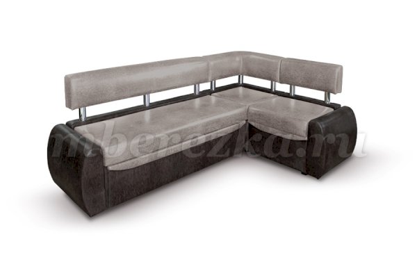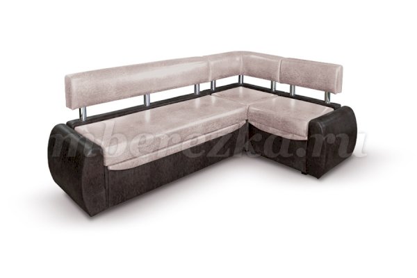 Небольшой раскладной кухонный уголок имеет обтекаемые округлые формы, что актуально для маленьких по площади кухонь. Такая мебель зрительно расширяет пространство, так как в ее дизайне не используются «ограничители» - строгие прямоугольные формы. Мягкость кухонному уголку придает наполнитель пенополиуретан.
