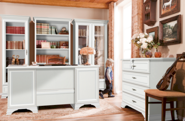 Кентаки - мебель классического стиля, отличающаяся природными цветами, отделкой фактурой, всегда актуально и востребована, она настолько универсальна, что без проблем впишется в любой современный дизайн. Стиль набора модульной мебели подчеркивается лакированной патинированной планкой в фасадах, карнизами - завершающим акцентом в зеркалах и высоких элементах набора, витиеватыми ручками. Четыре вместительных выдвижных ящика на металлических направляющих