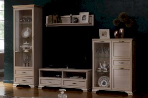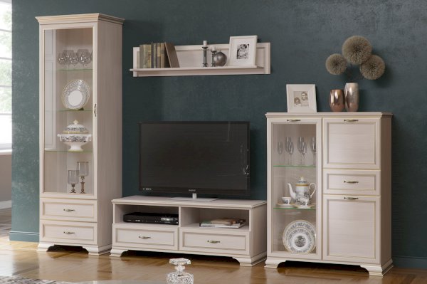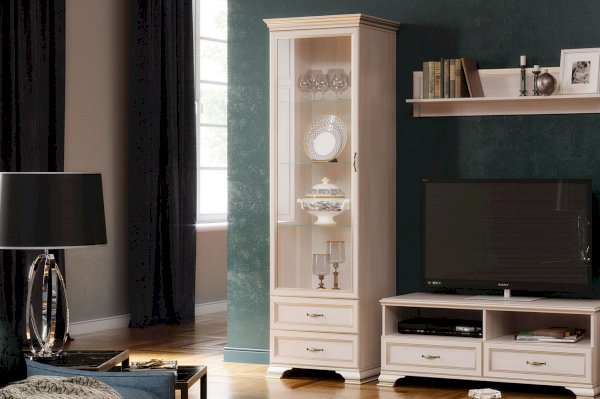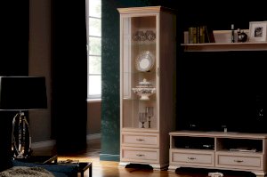 Благодаря прозрачному стеклу каждый сможет любоваться красивым наполнением витрины: сервизами, сувенирами или другими памятными мелочами. Такой модуль, безусловно, украсит интерьер современной гостиной в классическом стиле, обязательно оцените его достоинства: