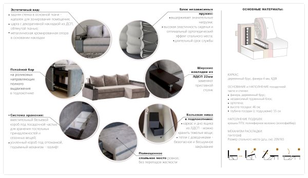 Материал каркаса: ЛДСП (Kronospan, класс Е1), ХДФ (Kronospan, класс Е1), Березовая фанера 4 мм, Строганный брус хвойных пород дерева
