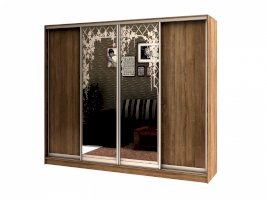 Данное изображение представлено в следующих цветах: корпус - Дуб Сонома, фасады - Дуб Сонома (2 шт.) и зеркало с пескоструйным рисунком (2 шт.), рамка двери и треки - Серебро матовое.