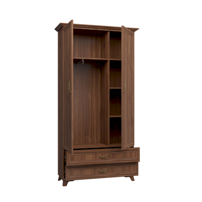 Шкаф привлекает внимание своими простыми формами и довольно лаконичным дизайном. Его глубина - 396 мм; ширина - 1077 мм. Благодаря большой глубине в шкафу можно хранить даже объёмные вещи. С левой стороны шкафа располагается отделение со штангой для вешалок. В нем спокойно поместится верхняя одежда и длинные платья. Правая сторона оснащена полочками для хранения текстиля и не габаритных вещей. Снизу конструкция шкафа дополняется двумя выдвижными ящиками. Материал из которого он изготовлен – ЛДСП.