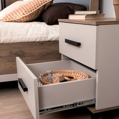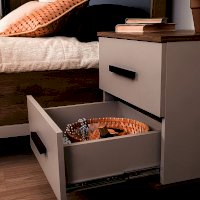 Малые мебельные формы - интересный и привлекательный тренд в дизайне интерьеров. Прикроватная тумба для спальни - не только удобный и необходимый предмет меблировки, но и зона для эстетического натюрморта: красивый торшер, любимые фотографии, с любовью подобранные аксессуары украшают спальню и дарят хорошее настроение. Низ и столешница тумбы выполнены из контрастной плиты ЛДСП Дуб Табачный. Выдвижные ящики оснащены шариковыми направляющими полного выдвижения, что предполагает их удобную и простую установку при сборке. Фигурные металлические опоры приподнимают тумбу и придают ей изысканный силуэт.