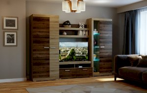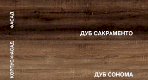 В гостиной Соната применяются современные европейские декоры: корпус выполнен из ЛДСП Дуб сонома, фасад из ЛДСП Дуб Сакраменто. Декоры отличаются выраженной тёплой древесной текстурой, а фасадная часть подчёркнута горизонтальными линиями текстуры и стильными планками МДФ, представляющими собой элементы корпуса и фасада.