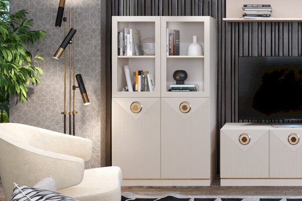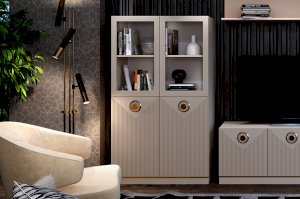 Конструкция шкафа-витрины включает 4 ниши за стеклодверками - здесь найдут свое место ваши памятные фото, сувениры и книги. В нижней части можно скрыть от глаз различные предметы обихода и личные вещи.