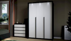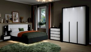 Мишель – это современная спальня с лаконичными формами и строгой геометрией в актуальных природных цветах. Оригинальная конструкция основания в сочетании со светодиодной подсветкой создают «эффект парения». Накладные светильники в комбинированном изголовье дают дополнительное освещение в ночное время, а мягкая накладка с вертикальной отстрочкой поддержит спину во время отдыха. Отсутствие лицевой фурнитуры в ящиках и комодах подчеркивают минималистичный дизайн спальни, а контрастные ручки шкафов оттеняют белизну фасадов.