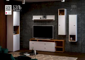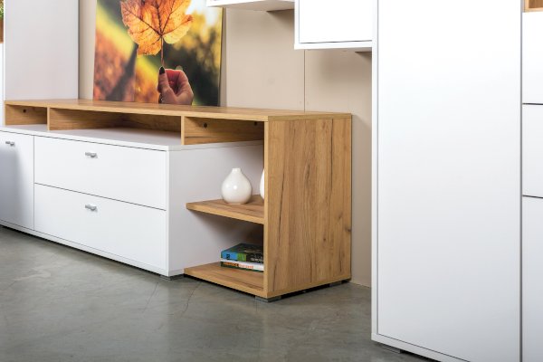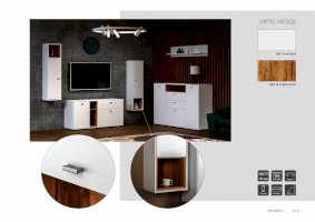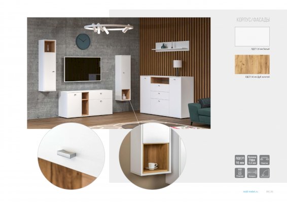Дуб вотан/Белый премиум Гостиная модульная система сочетает в себе актуальные цвета и функциональную геометрическую форму с мотивами конструктивизма.