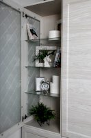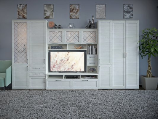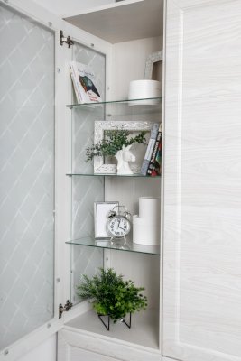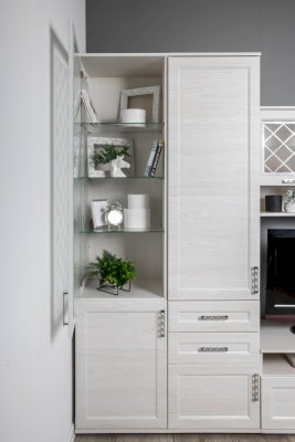 Витрина со стеклянной дверцей и боковиной, за которыми просматриваются полки и выставленные на них предметы. Стекло делает витрину визуально легкой, компактной, а всему помещению добавляет света и торжественности. Шкаф витрину можно использовать не только в сочетании с другими модулями гостиной, но и как отдельный предмет мебели.