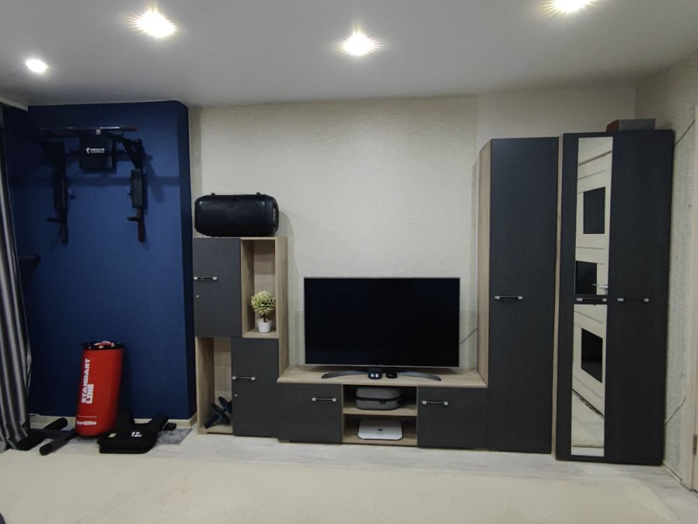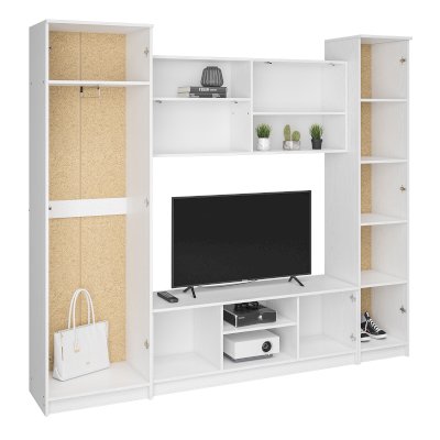 хорошая, вместимая гостиная, хорошо смотрится в современном интерьере в тёмном цвете. Удобно, что есть закрытые полки и шкаф, куда можно повесить одежду
