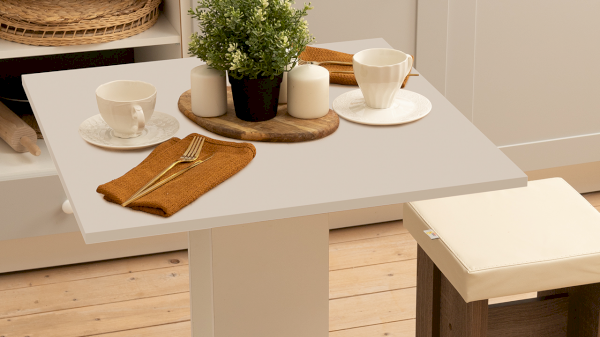 Для декора использованы выразительные сочетания модных и актуальных оттенков. Имитирующая камень текстура в комбинации с белым цветом и композиция, сочетающая в себе древесные волокна создают потрясающий внешний вид. Белое подстолье придаёт лёгкость и невесомость, выгодно выделяя данную модель.