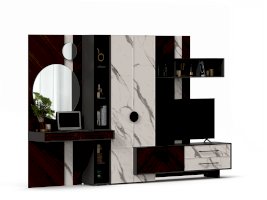- Модуль скомбинирован из наборной панели, шкафа одностворчатого, тумбы для ТВ и открытых полок