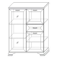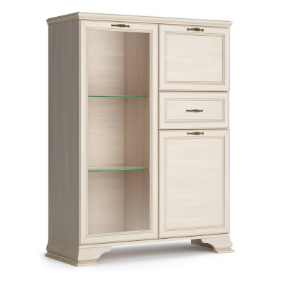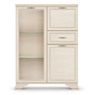 Стеклодверь дает возможность любоваться красотой наполнения шкафа, а система ящиков и отделений с дверками поможет хранить в закрытом любые предметы.