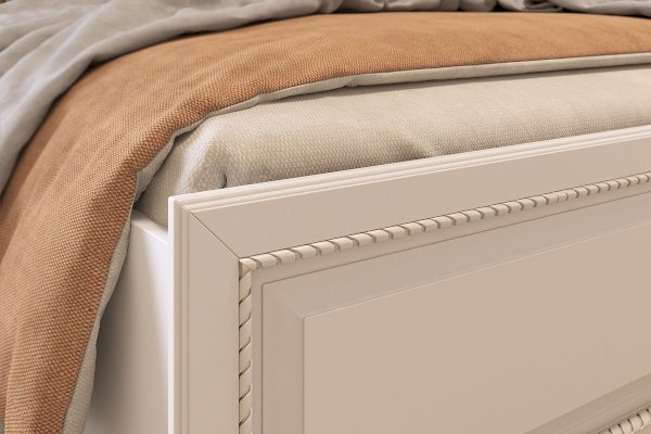 Кровать выполнена в актуальном цвете джелато, который располагает к спокойствию и уюту, а также оснащена основанием, которое обеспечит здоровый и крепкий сон. Спинки кровати украшены объемным декоративным элементом и фрезеровкой с патиной.