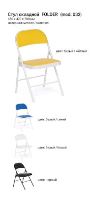 Складной стул «Фолдер» ― легкая экономичная современная модель из металла. Он незаменим в небольших пространствах. Стул занимает немного места при хранении и удобен для транспортировки. Каркас изготовлен из прочного стального сплава, мягкие сиденье и спинка ― из экокожи в яркой цветной отделке.