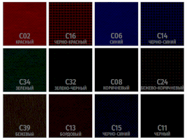 | Цвет | БЕЖЕВЫЙ / БЕЛЫЙ / ГОЛУБОЙ / ЖЕЛТЫЙ / ЗЕЛЕНЫЙ / КРАСНЫЙ / ОРАНЖЕВЫЙ / РОЗОВЫЙ / СЕРЫЙ / СИНИЙ / СИРЕНЕВЫЙ / ЧЕРНЫЙ |