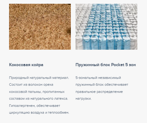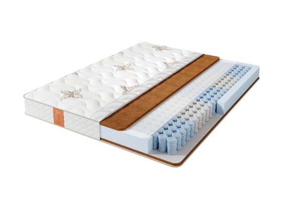 В основе матраса блок независимых пружин Pocket 5 Zone, имеющий 5 зон различной степени упругости, плотностью 512 пружин на спальное место. Благодаря использованию проволоки различного диаметра каждая из зон обеспечивает правильную поддержку позвоночника и правильное распределение нагрузки. В качестве наполнителя используется натуральная кокосовая койра. Матрас с кокосовой койрой самый жесткий в коллекции Eco.Чехол выполнен из приятного турецкого трикотажа с вискозой, простеганного на объемном гипоаллергенном синтепоне.