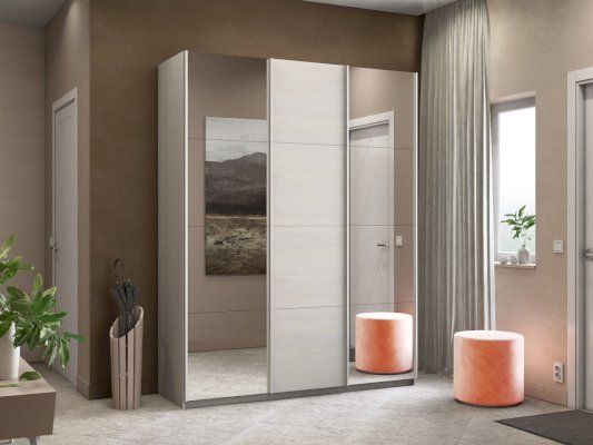 Серия «Прайм» отличается доступностью и функциональностью Навесные двери и лаконичная отделка фасадов создают прогрессивный дизайн. Подойдет тем, кто любит компактную и изящную мебель. Алюминиевые ручки и верхний ходовой профиль обеспечивают легкость и прочность конструкции. Многолетняя безупречная работа благодаря высококачественной немецкой фурнитуре Hettich. Прочная ПВХ-кромка толщиной до 1 мм защищает края от сколов и повреждений. Плавный ход дверей обеспечивает надежная система Hettich Top Line M. Дополнительно можно установить доводчики. Снаружи нет заглушек и винтов благодаря стяжечной системе крепления полок на флипперах, а корпус усилен эксцентриковыми стяжками. Навесные двери скрывают раздвижной механизм от глаз. Они надежно удерживаются в направляющих и не соскакивают. Каждая дверь поделена на 4 секции Секции расставляются в произвольном порядке, создавая новый дизайн фасада.