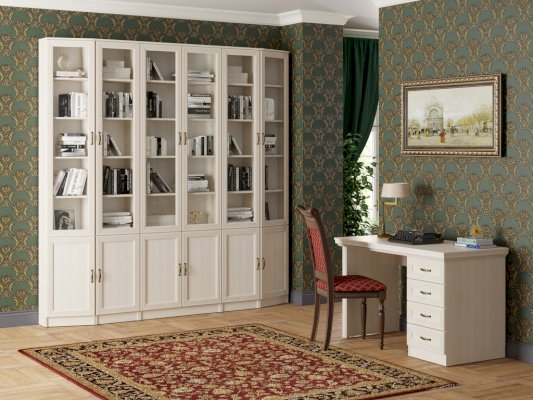 Ручка-скоба выполнена из металла бронзового цвета. Она удобна в использовании и проста в установке. В коллекции 5 модулей, их количество оптимально для создания композиции для кабинета. Кроме того шкаф можно использовать как самостоятельный модуль в других жилых и офисных помещениях.