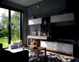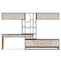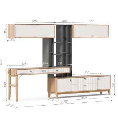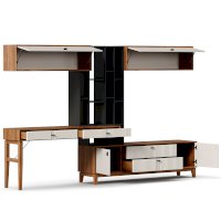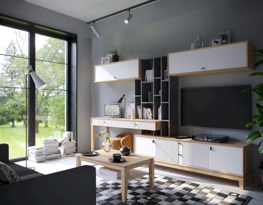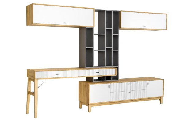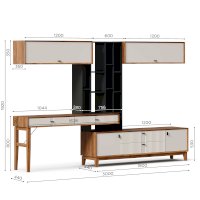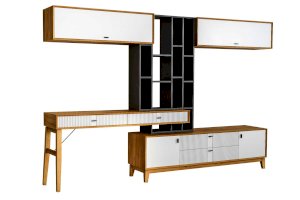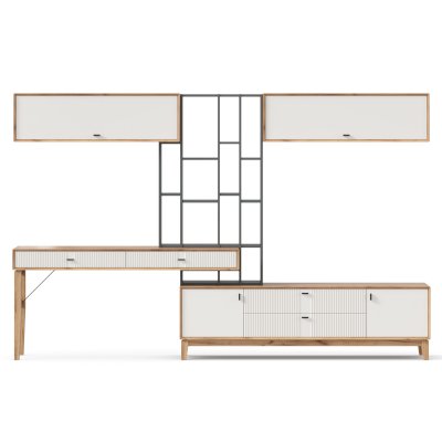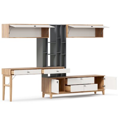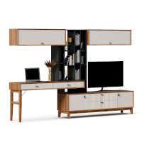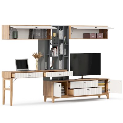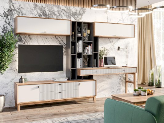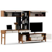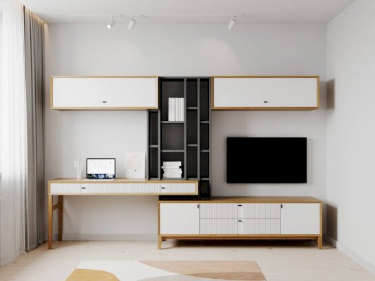 • На тумбу ТВ опирается вертикальный открытый стеллаж с полками, в который установлен стол-консоль с опорными ножками ППУ с одной стороны.