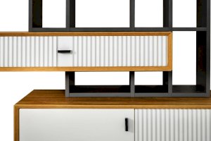 • В центре тумбы два выдвижных ящика на направляющих нижнего крепления неполного выдвижения с доводчиком. Слева и справа за распашными дверями ниши.