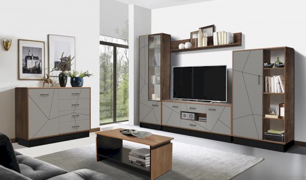 Журнальный стол, в отличие от других корпусных модулей, выполнен в одном цвете – таксония. Поэтому он выделяется на их фоне и привлекает к себе внимание. Такой столик нужен обязательно! На боковых стенках-опорах сделаны накладки, которые придают внешнему дизайну эффект 3-Д, поскольку панели находятся на разных уровнях.