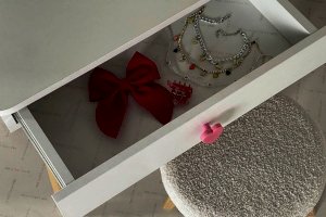 Отличным подарком для Вашей дочки будет комплект - трюмо с зеркалом, выдвижным ящиком и замечательным стульчиком в едином стиле.