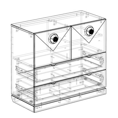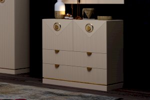 Конструкция комода включает два широких ящика, а также два закрытых отделения с дверками. Украсить интерьер можно разместив на столешнице комода декоративные предметы, вазы или любимые фотографии.