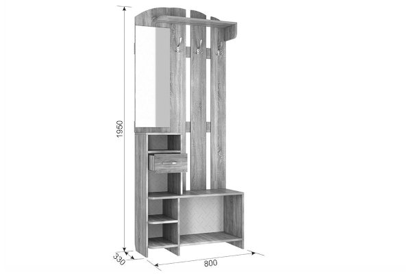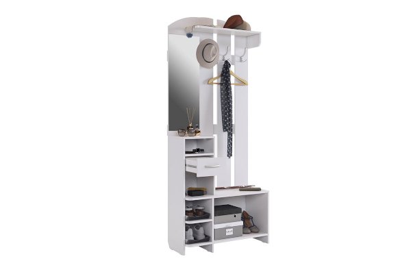 «Мила» создана для Вашей прихожей – Вы можете повесить одежду и сумку на металлические крючки, шляпки положить на полку сверху, нужные мелочи – в выдвижной ящик. На открытых полках можно разместить зонты, перчатки и шарфы. Есть зеркало и обувница.