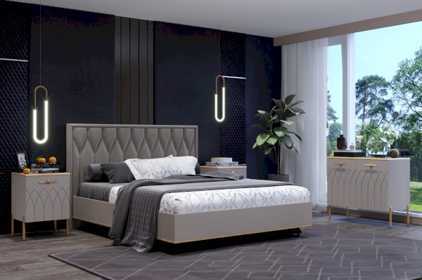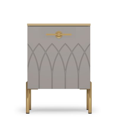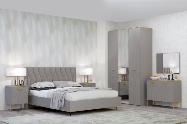 • МДФ фасады изделия оформлены пленкой ПВХ с бархатной поверхностью soft touch. А в качестве яркого декора применяется фрезеровка фасадов, золотая кромка и металлическая фурнитура в цвете золото.