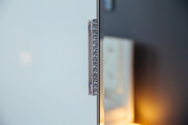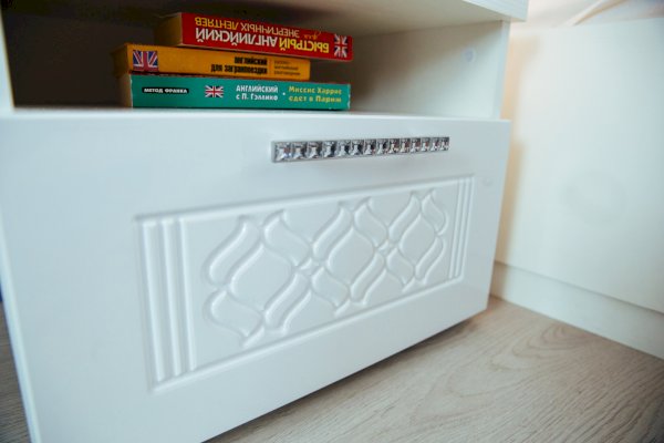 - Белые глянцевые фасады МДФ с фрезеровкой «Орхидея», украшенные ручками с кристаллами.
