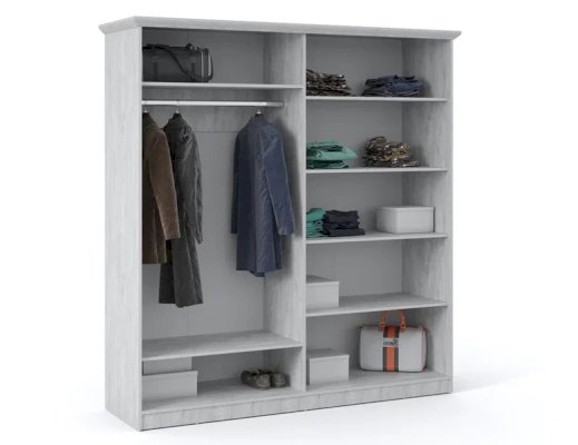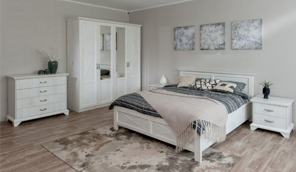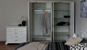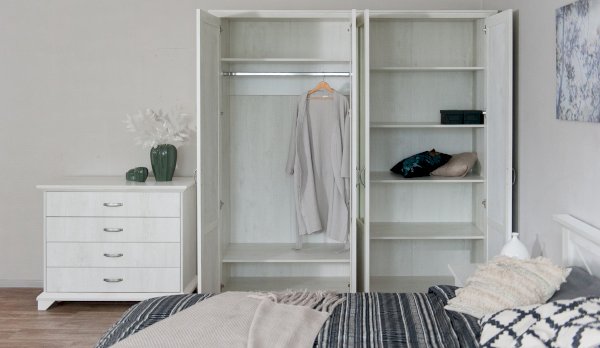 Распашной четырехдверный шкаф выполнен в популярном стиле неоклассика – белые рамочные фасады с фактурой и рисунком натурального дерева, декоративные крестообразные накладки, фигурные ножки и карниз все это придает комнате элегантный и светлый вид. Вместительные отделения со штангой и полками поместит в себя верхнюю одежду, коробки с обувью и головные уборы. Мебель выполнена из экологичных материалов.