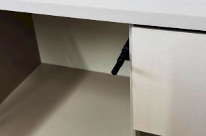 Другая сторона комода оснащена выкатным ящиком и фасадом со стеклом, обладающим зеркальным эффектом. Это не только добавляет современности и шарма, но и обеспечивает дополнительное пространство для хранения декоративных предметов и книг.